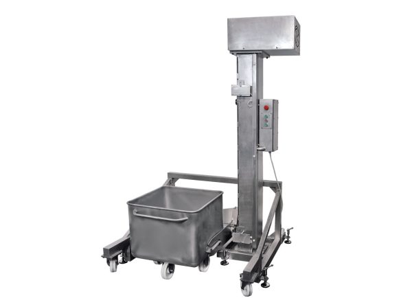 Подъемник — Загружатель ПЗ-01 предназначен для загрузки сырья в дежу (бункер) любого оборудования: волчок, мешалка, фаршемешалка, шприц и др. Захватывающий механизм Подъемника рассчитан на тележки ёмкостью 100-200 литров и может быть изготовлен индивидуально под Ваши тележки.